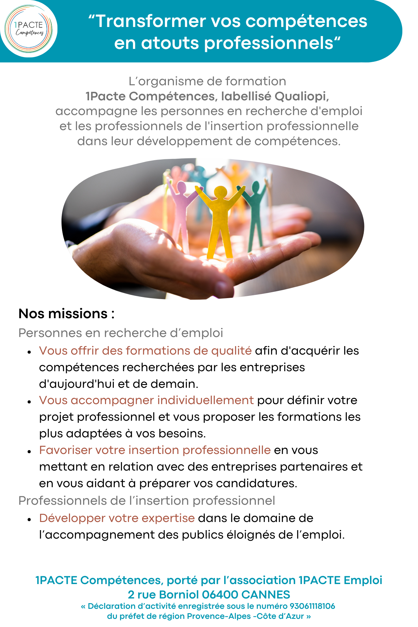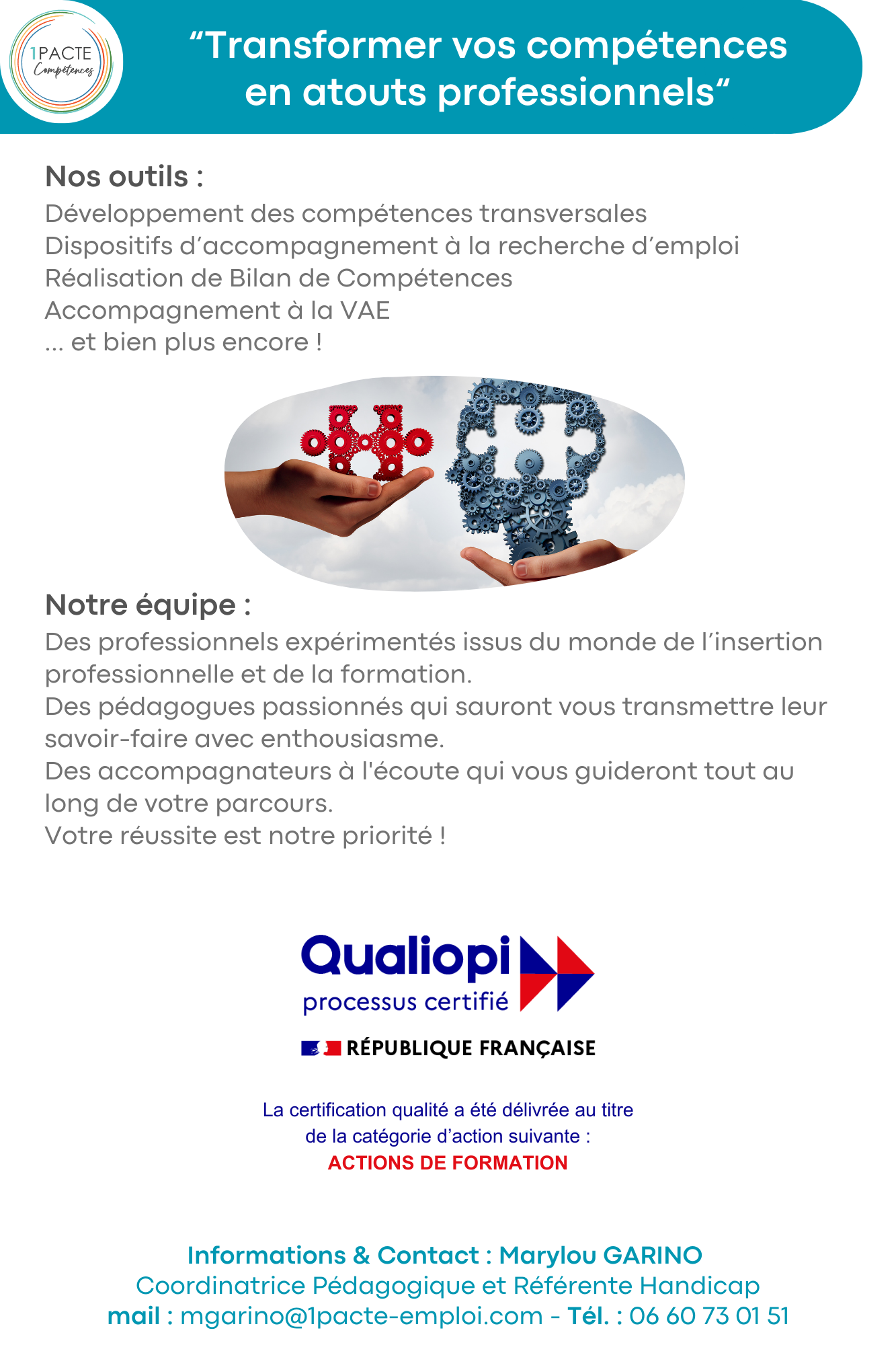 1PACTE Compétences proposera très prochainement de vous soutenir aussi dans vos démarches d’accompagnement à la VAE et dans la réalisation de Bilan de compétences.